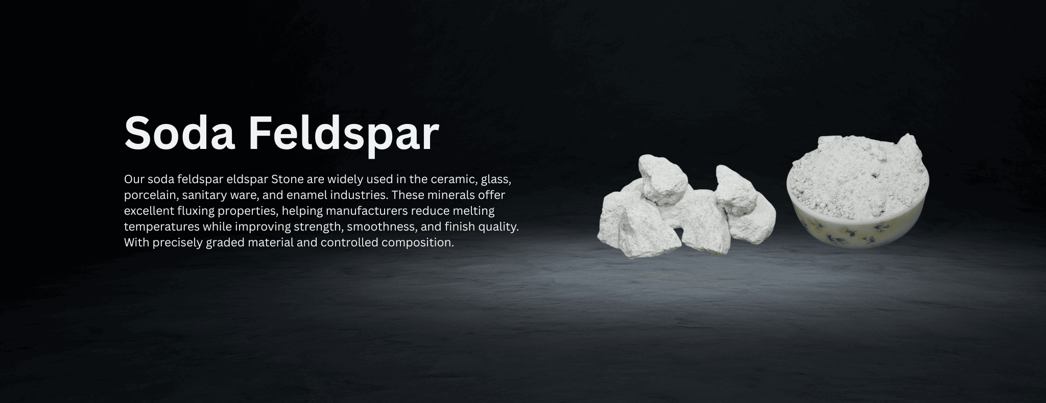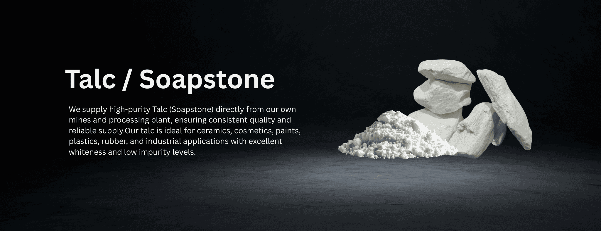 Your trusted partner for Talc Powder, Soapstone, Quartz Stone, Feldspar, Quartzite, Decorative Boulders, Quartz Slabs, and more.